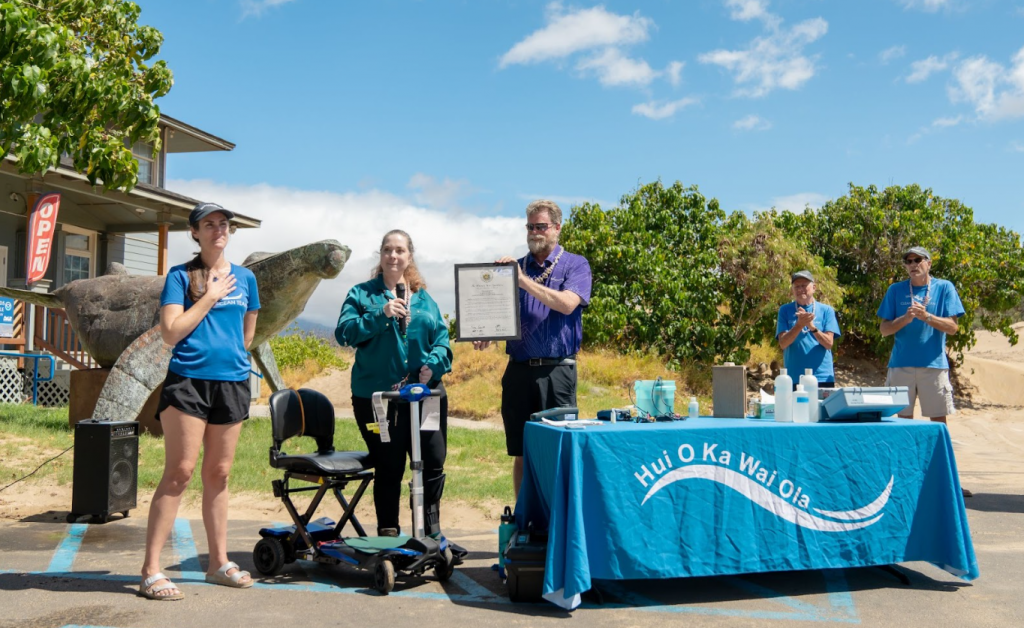 At a beachside ceremony on Monday, July 17 at the Hawaiian Islands Humpback Whale National Marine Sanctuary in Kihei, the 100th sample was collected from Kalepolepo Beach Park by HOKWO program volunteers Scott Graves and Harry Hecht alongside Team Lead Maile Sharpe. The event was attended by Senator Angus McKelvey, Representative Terez Amato, Councilmember Tom Cook, Mayor Bissen’s Executive Assistant Sharon Banaag, all of whom assisted HOKWO Staff Liz Yannell and Ylenia St-Louis in testing the 100th water sample for turbidity, temperature, salinity, dissolved oxygen, and pH. The HOKWO program was presented with a Certificate in Appreciation of HOKWO Commemorating the 100th Water Sampling from the Hawaii State Legislature by Rep. Amato and Sen. McKelvey.