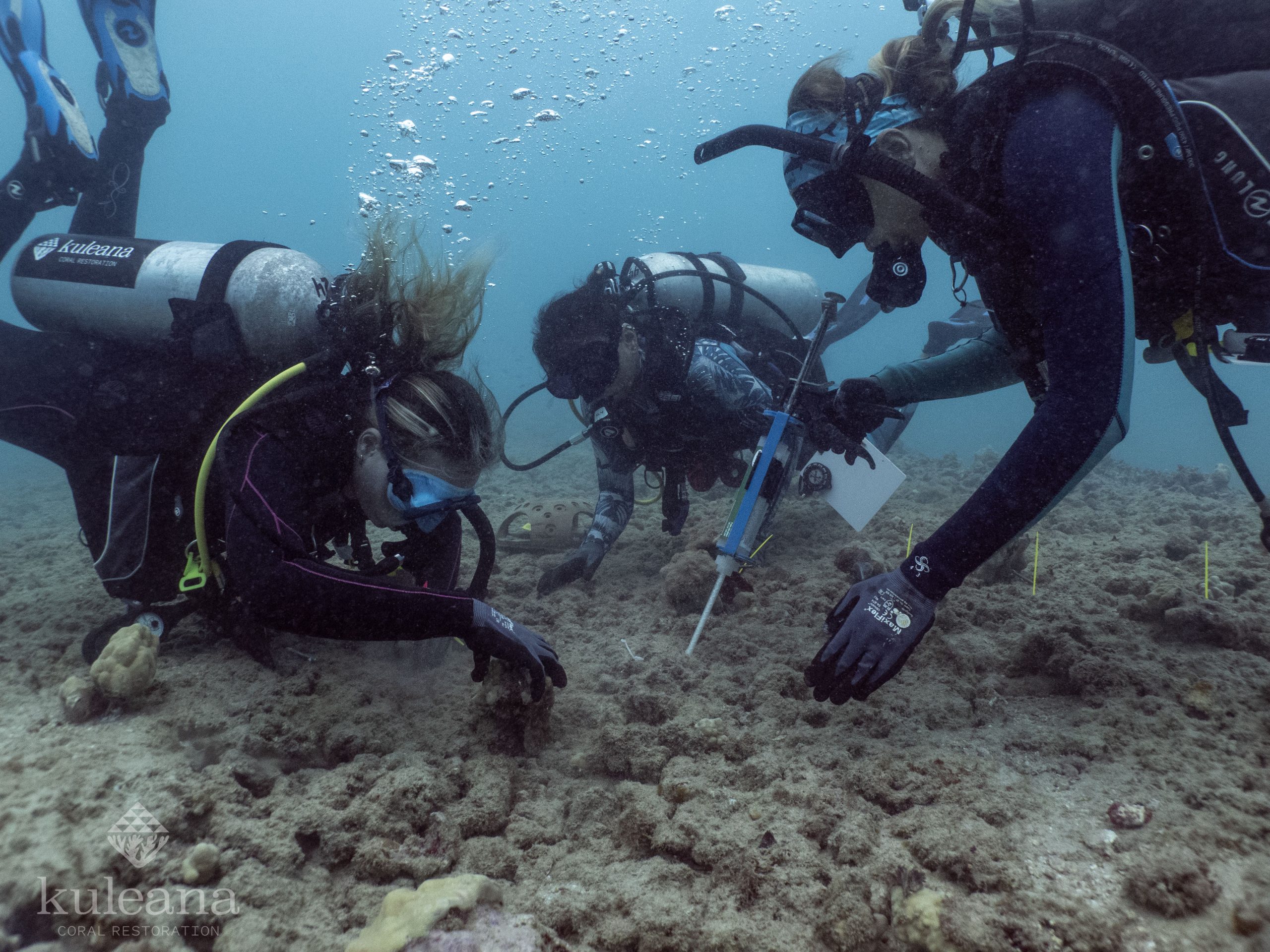 We look for areas that have a pavement-type substrate and for what we call ‘corals of opportunity’ (COO) that can be reattached to bare or exposed areas of the reef. COO are pieces of coral that have been dislodged, broken off, or turned over from the reef, and we take those and reattach them to bare areas of the reef, which hopefully will give them a better chance at life to reestablish coral cover and provide fish habitat. We are careful not to move corals from where we source them, always trying to keep them in one spot. With that in mind, all of the work is done on the boat or in the water directly above the site, we don’t transfer any of these corals to a lab or coral nursery on land. All of this work is done under permitting with Kuleana Coral Restoration who have shown success with these methods on Oʻahu.