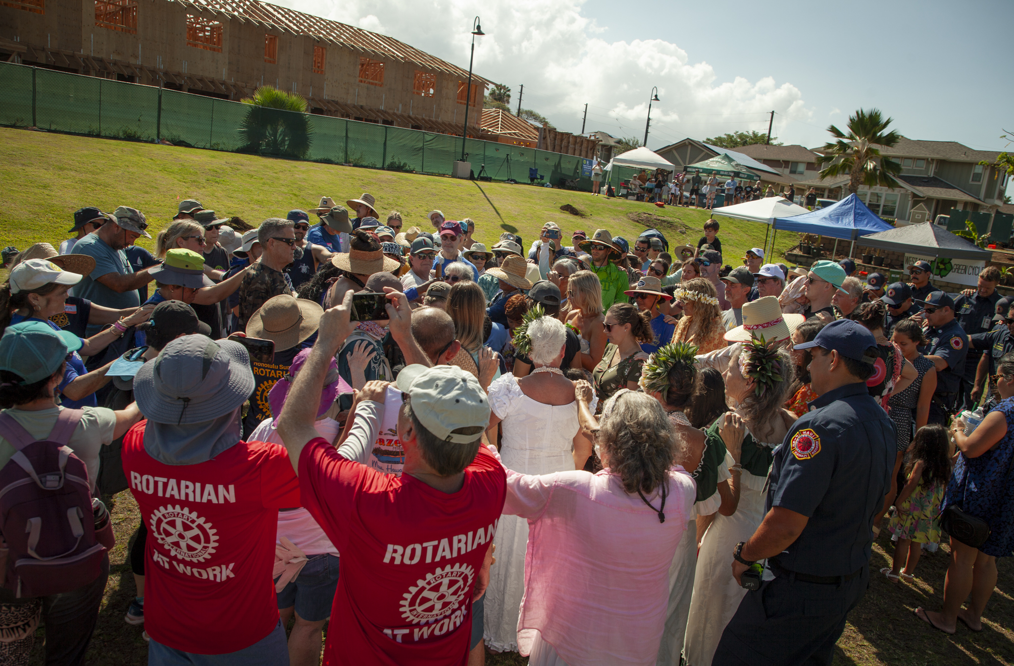 Volunteers, community members, and local businesses and organizations gathered at the park space in Kahoma Village to begin the planting day with a blessing. (Photo Credit: Studio Asalt and Derek Sander)