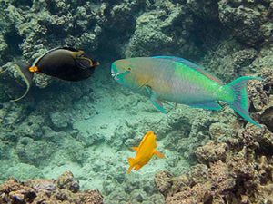 Some of Hawaii’s reef fishes: Orangespine Unicornfish, Parrotfish and Yellow Tang